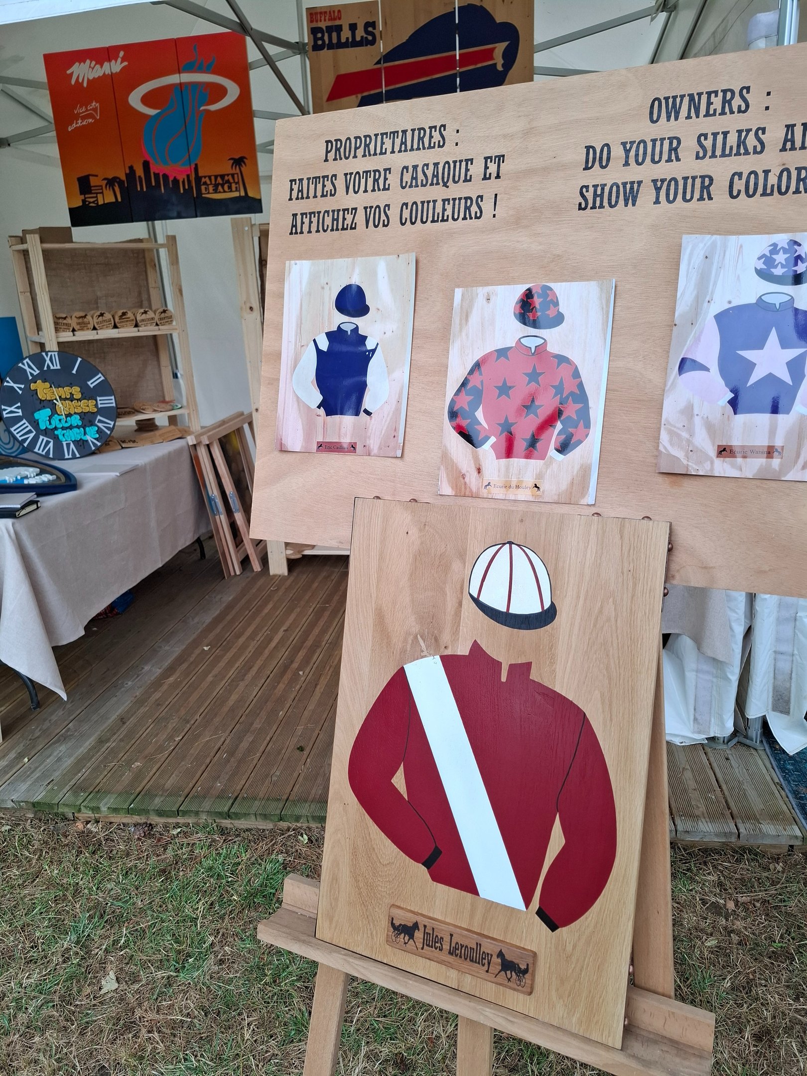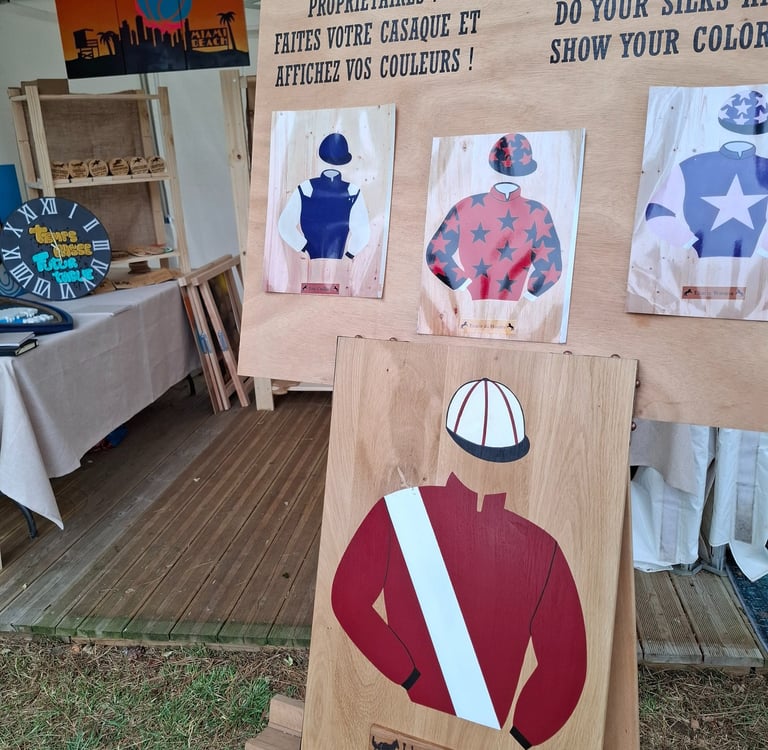 Car oui, il s'agit de notre seconde année sur l'hippodrome. Après une saison 2024 où nous avons découvert les joies, les surprises et les interrogations de la gestion d'un stand et d'une relation au client en direct, nous revenons gonflés à bloc ! Avec un nouvel agencement du stand et de nouveaux produits personnalisables, comme nos horloges ou nos nouvelles gammes de casaques, en porte-clés ou en statuette.